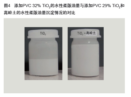 通過檢查油墨在長期貯存后的沉淀率,可驗(yàn)證高嶺土在液體 油墨中的超細(xì)粒徑和良好分散性。圖4照片顯示與只含TiO2的參照 油墨相比,同時(shí)含有TiO2和研磨超細(xì)高嶺土的水性柔版油墨2周后 的沉淀率(脫水收縮作用)降低情況。