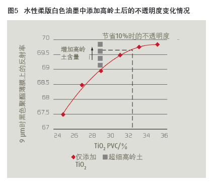 另一個(gè)感興趣的是保持配方中相同體積固含量(油墨干燥膜厚 相同),將TiO2 PVC含量維持在29%(低于非常稠密情況下的最佳 量),通過添加超細(xì)層狀高嶺土顆粒,來"間隔"TiO2顆粒。圖5表 明在PVC29% TiO2配方中高嶺土含量的增大可提高干油墨膜不透明 度。因此,僅含TiO2的配方不透明度性雖然也可以達(dá)到,但TiO2含量 要更高。圖中的虛線表示TiO2降低約10%。
