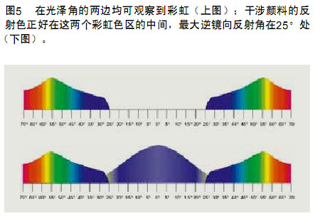> 彩虹在逆鏡向反射角約35°~45°范圍內開始出現彩虹色,根據種類的不同,干涉顏料顯示其反射色逆鏡向反射角約為 25°。兩種色彩范圍可通過兩種顏料混合獲得。
