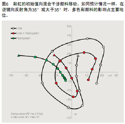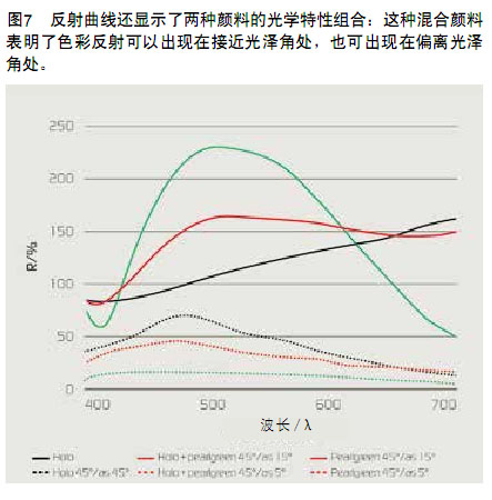 > 從上述多色彩顏料的噴漆圖可看出,在觀察角的任意一側都可檢測到兩道彩虹帶之間出現一個間隙?杉尤敫缮骖伭咸钛a這個間隙。此類混合物可用多種方式制成,干涉顏料的選定顏色也可能影響彩虹色(見圖5、圖6和圖7)。