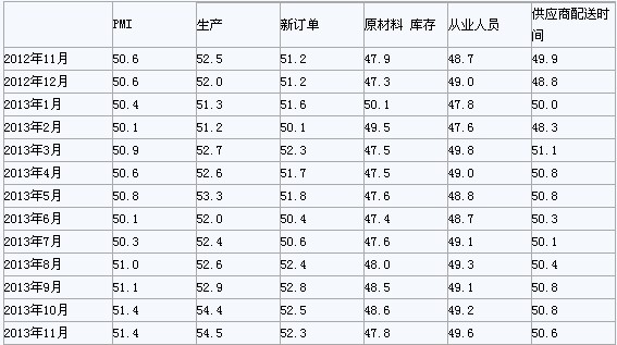 2013年11月,構成制造業(yè)PMI的5個分類指數(shù)2升3降。生產(chǎn)指數(shù)為54.5%,比上月略升0.1個百分點,連續(xù)5個月回升,為2012年5月以來的最高點。新訂單指數(shù)為52.3%,比上月回落0.2個百分點。調(diào)查顯示,反映制造業(yè)外貿(mào)情況的新出口訂單指數(shù)為50.6%,比上月上升0.2個百分點,連續(xù)4個月位于臨界點以上;進口指數(shù)為50.5%,比上月上升0.5個百分點。