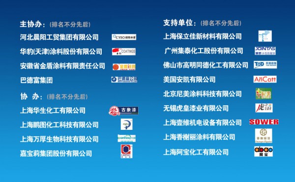 本次會(huì)議得到了河北晨陽(yáng)工貿(mào)集團(tuán)有限公司、華豹(天津)涂料股份有限公司、安徽省金盾涂料有限責(zé)任公司、巴德富集團(tuán)、上海華生化工有限公司、上海鵬圖化工科技有限公司、上海萬(wàn)厚生物科技有限公司、嘉寶莉集團(tuán)股份有限公司、上海保立佳新材料有限公司、廣州集泰化工股份有限公司、佛山市高明同德化工有限公司、美國(guó)安凱有限公司、北京尼美涂料科技有限公司、上海壹維機(jī)電設(shè)備有限公司、上海香榭麗涂料有限公司、上海阿寶化工有限公司、山西亮龍涂料有限公司的大力支持。