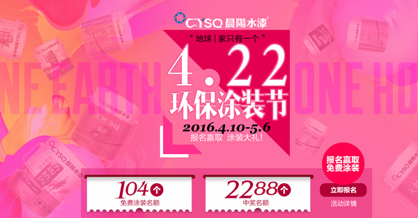 為響應(yīng)綠色地球日的環(huán)保主題,4月10日起,晨陽水漆全面開啟“百城百家”活動,將聯(lián)合全國104個重點城市選出104個幸運家庭。晨陽水漆將發(fā)動經(jīng)銷商、新老客戶及社會各界人士一起,打響本年度家裝服務(wù)的關(guān)鍵一槍!