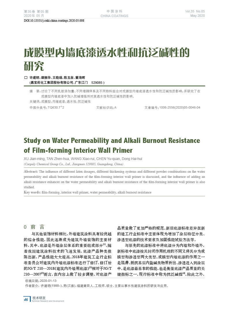 成膜型內墻底漆透水性和抗泛堿性的研究