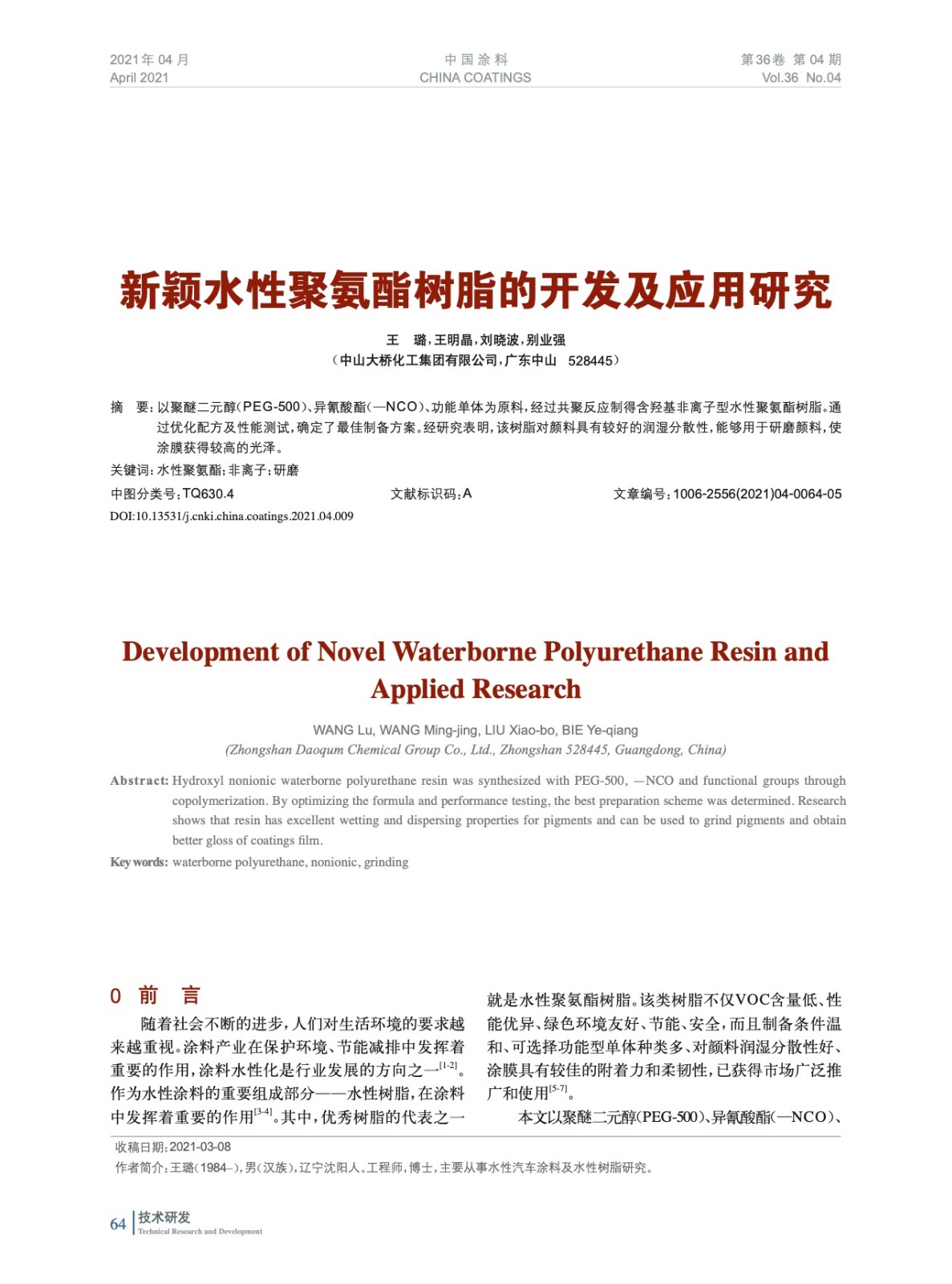 本文系作者@王 璐,王明晶,劉曉波,別業強 授權中國涂料網發表,并經中國涂料網編輯,未經允許不得轉載,如需轉載請聯系chinacoatingnet@vip.163.com