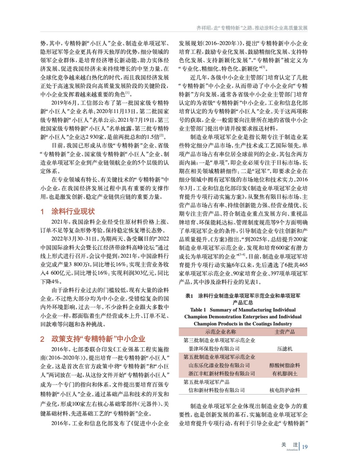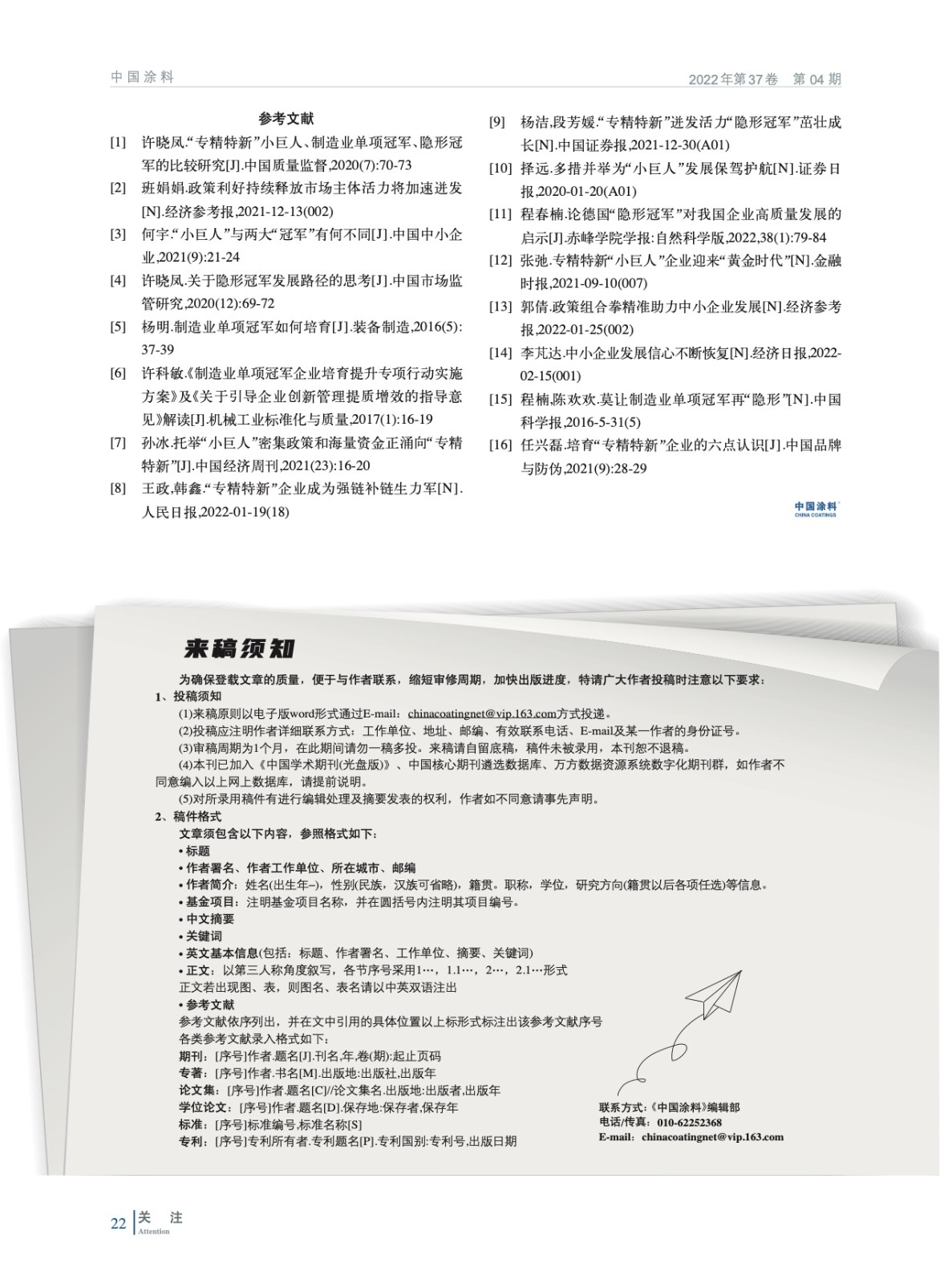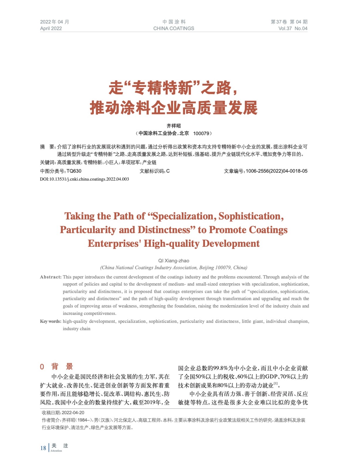介紹了涂料行業的發展現狀和遇到的問題,通過分析得出政策和資本均支持專精特新中小企業的發展,提出涂料企業可通過轉型升級走“專精特新”之路、走高質量發展之路,達到補短板、強基礎、提升產業鏈現代化水平、增加競爭力等目的。