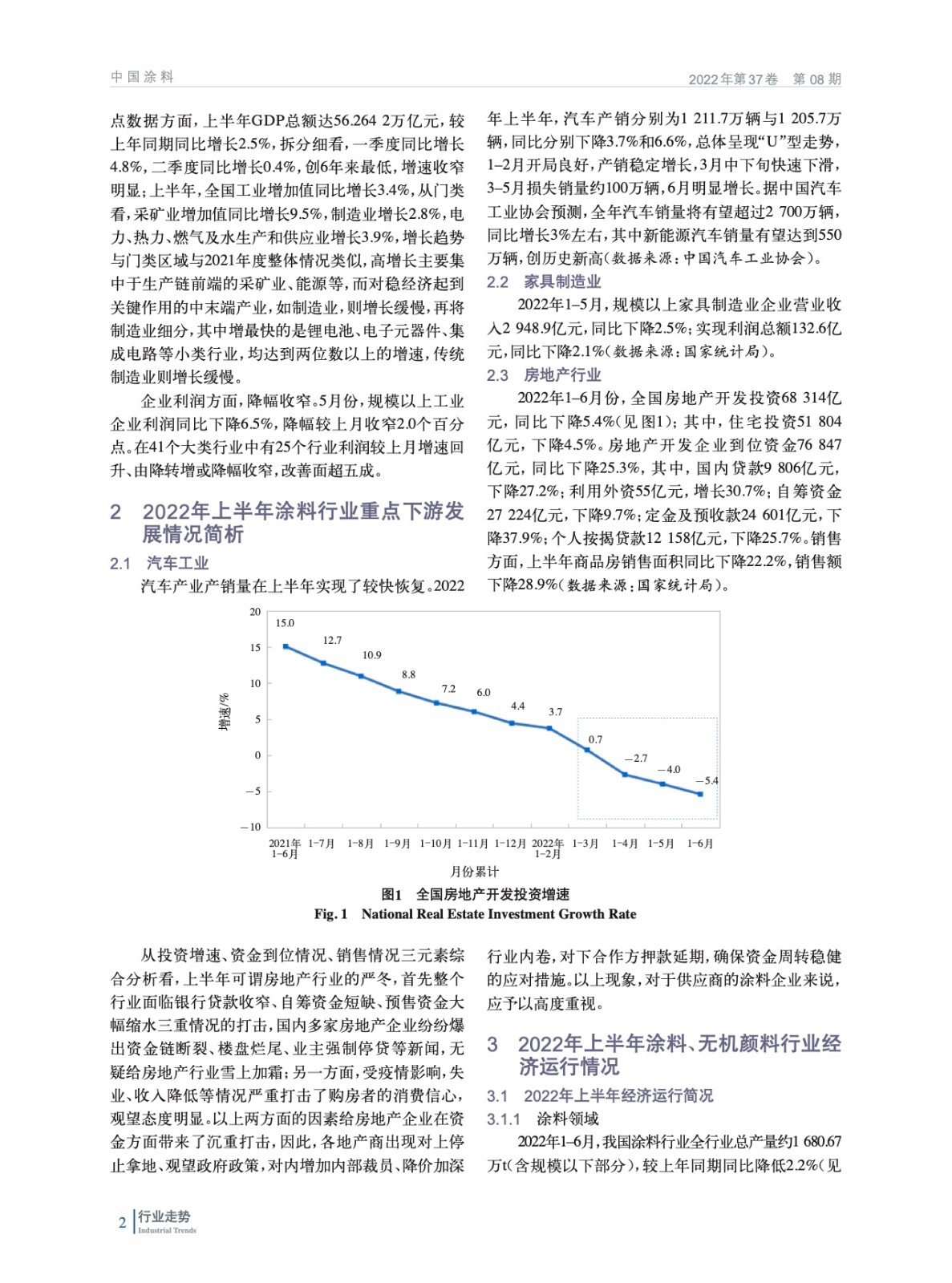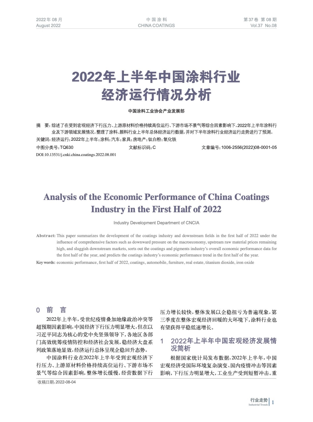 綜述了在受到宏觀經濟下行壓力、上游原材料價格持續高位運行、下游市場不景氣等綜合因素影響下,2022年上半年涂料行業及下游領域發展情況,整理了涂料、顏料行業上半年總體經濟運行數據,并對下半年涂料行業經濟運行走勢進行了預測。