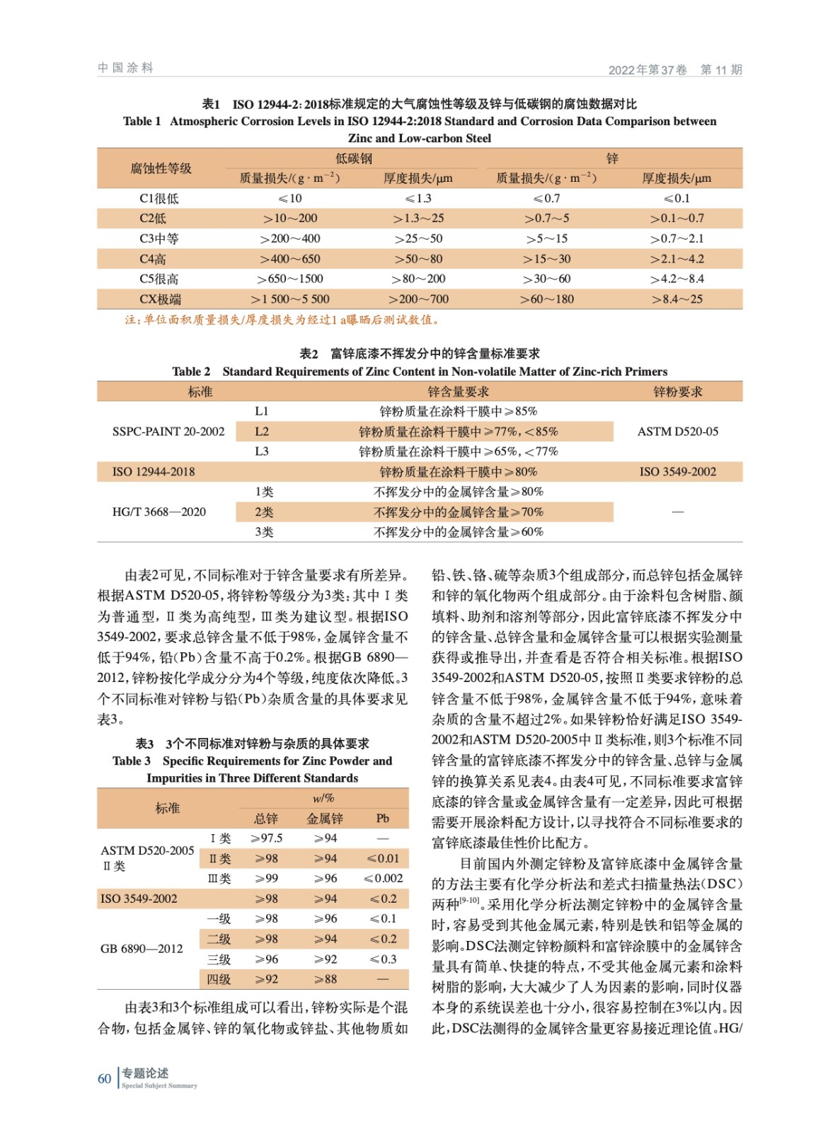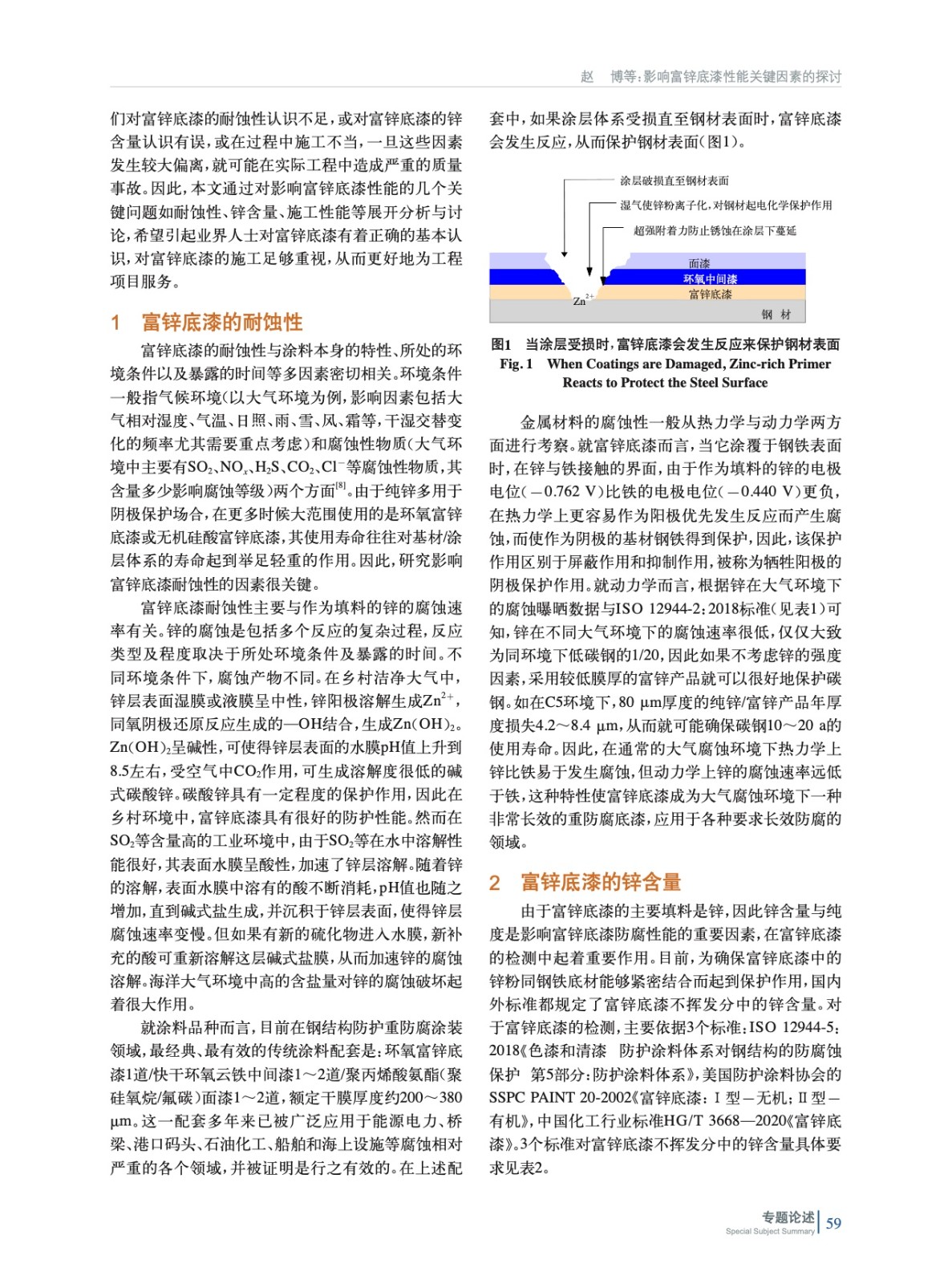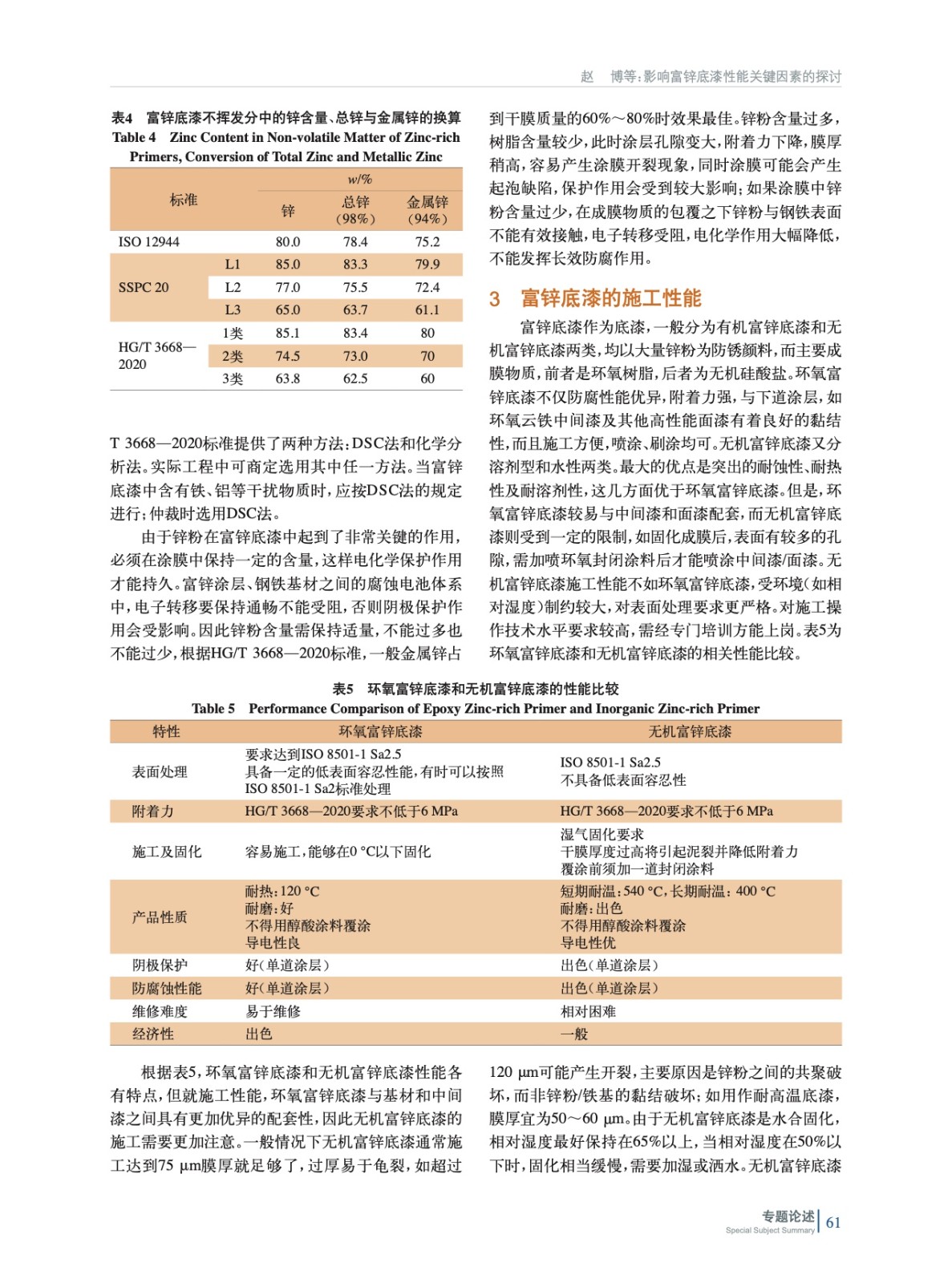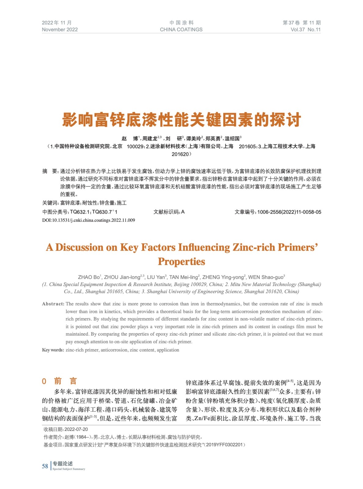 摘要:通過分析鋅在熱力學上比鐵易于發生腐蝕,但動力學上鋅的腐蝕速率遠低于鐵,為富鋅底漆的長效防腐保護機理找到理論依據。通過研究不同標準對富鋅底漆不揮發分中的鋅含量要求,指出鋅粉在富鋅底漆中起到了十分關鍵的作用,必須在涂膜中保持一定的含量。通過比較環氧富鋅底漆和無機硅酸富鋅底漆的性能,指出必須對富鋅底漆的現場施工產生足夠的重視。