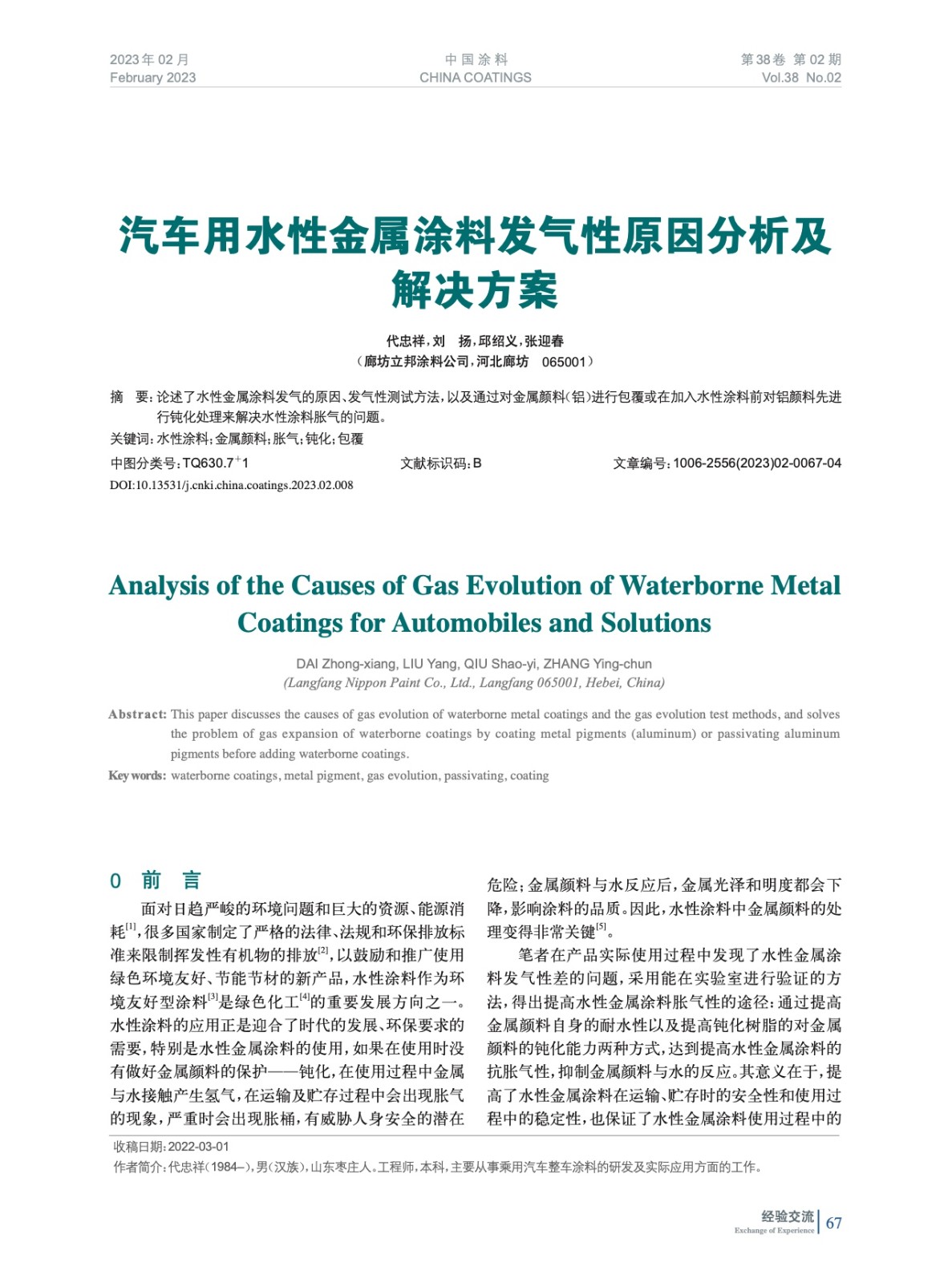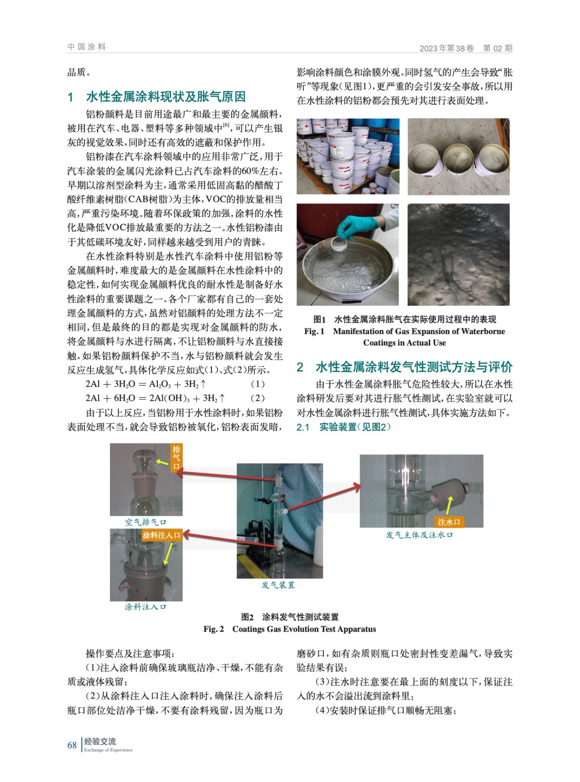 論述了水性金屬涂料發(fā)氣的原因、發(fā)氣性測試方法,以及通過對金屬顏料(鋁)進行包覆或在加入水性涂料前對鋁顏料先進行鈍化處理來解決水性涂料脹氣的問題。