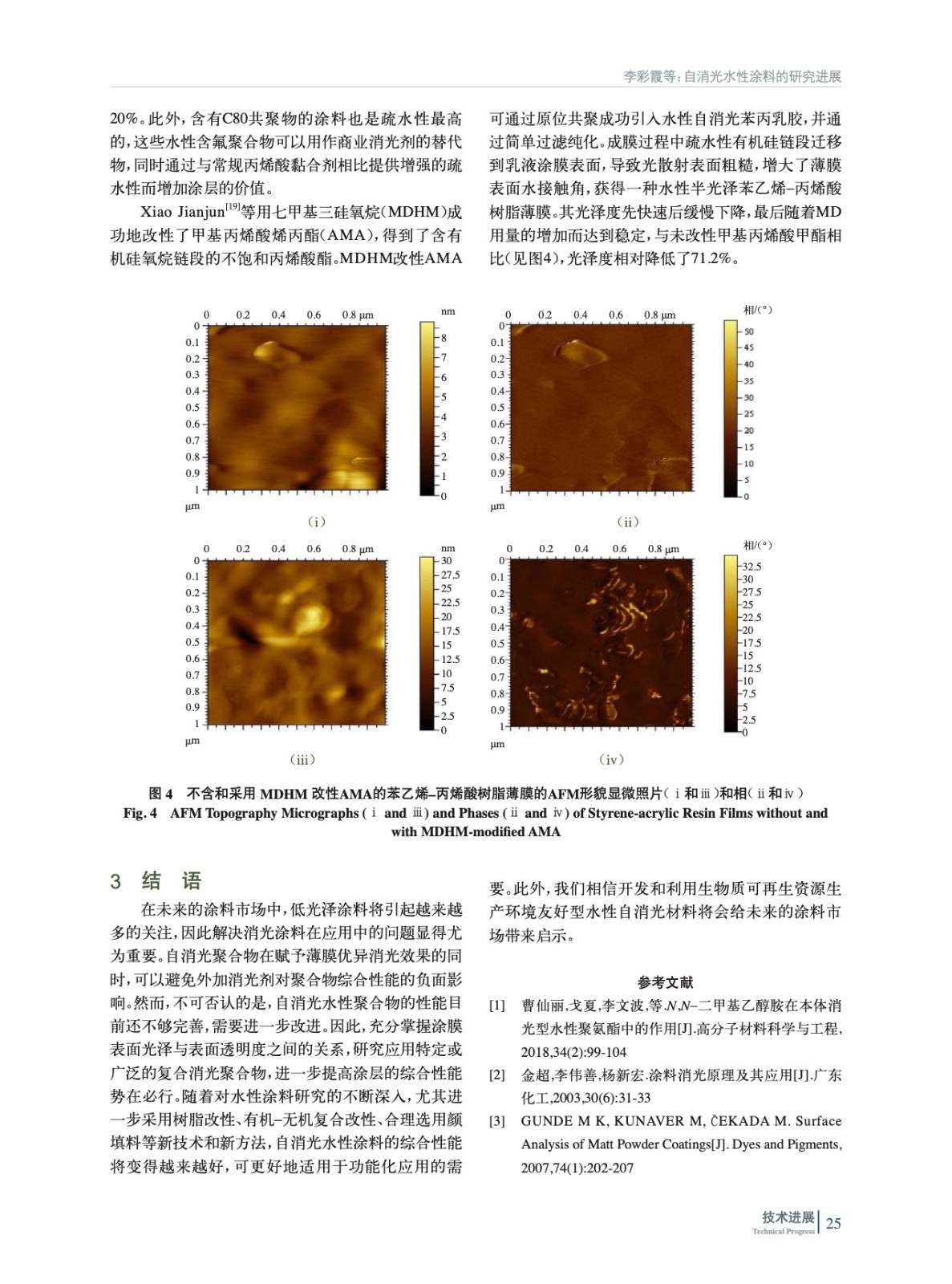 從光澤度和消光策略兩個方面介紹自消光涂料的消光機理,對目前自消光水性涂料的研究現狀及進展進行了系統論述,并對自消光水性聚合物目前存在的缺陷進行了簡單闡述,給出了建議與展望。