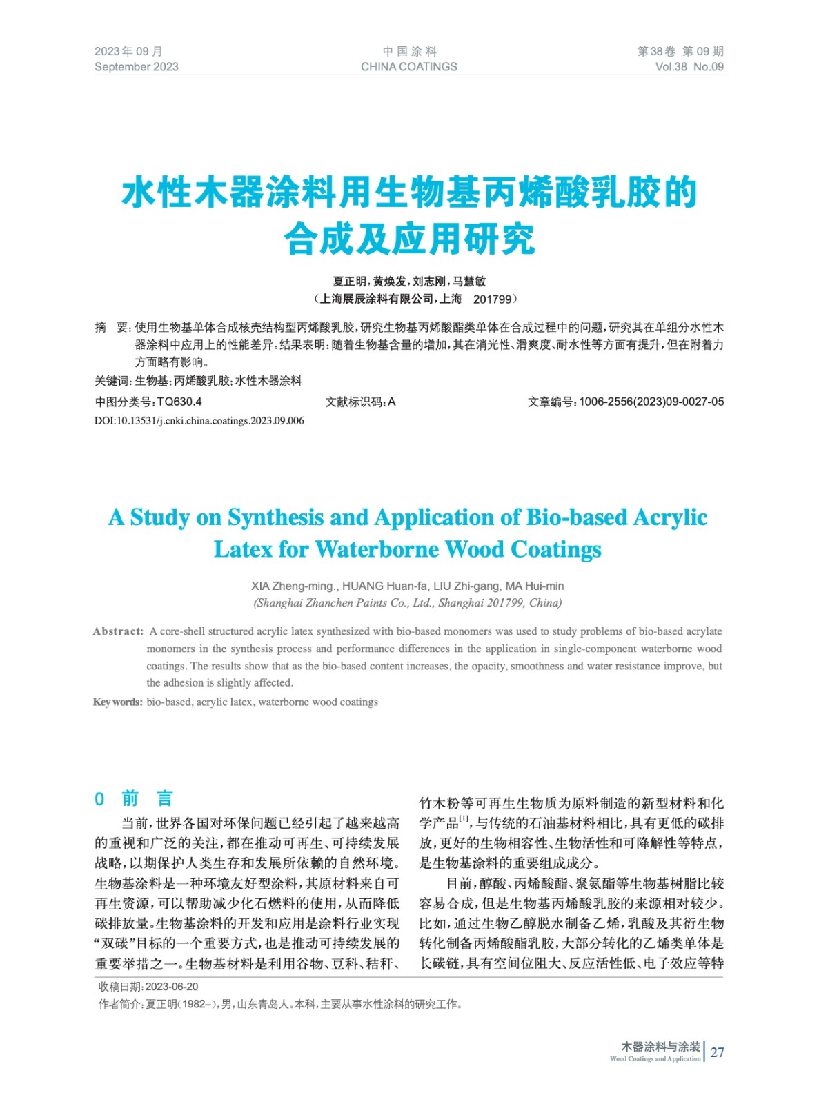 使用生物基單體合成核殼結構型丙烯酸乳膠,研究生物基丙烯酸酯類單體在合成過程中的問題,研究其在單組分水性木器涂料中應用上的性能差異。結果表明:隨著生物基含量的增加,其在消光性、滑爽度、耐水性等方面有提升,但在附著力方面略有影響。