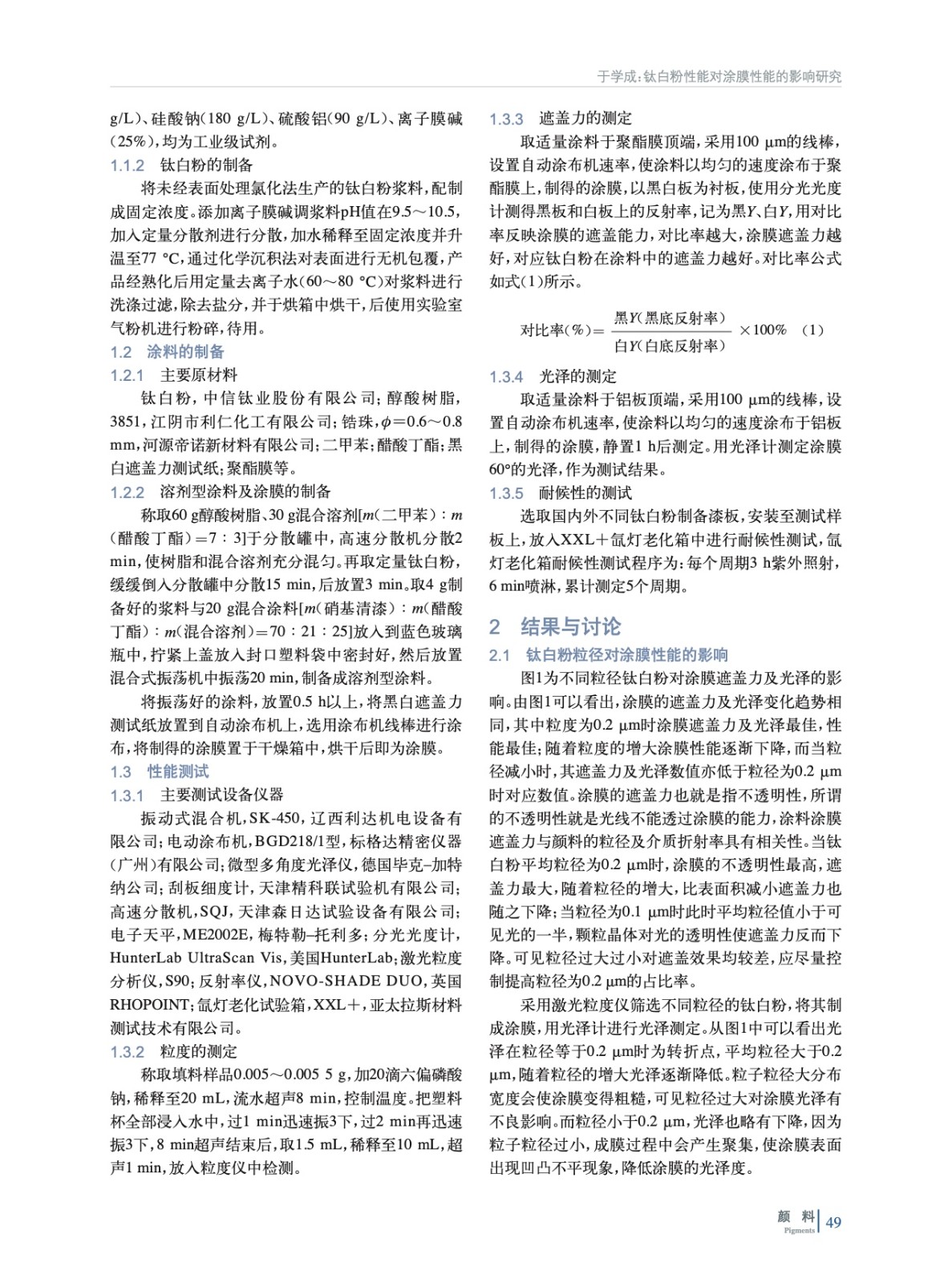 針對鈦白粉粒度、吸油量、分散性、顏料體積濃度(PVC)對涂膜性能的影響進行研究,通過對比涂膜光澤及遮蓋力的測試結果,確定鈦白粉最佳性能參數,并選取不同包覆方式的國內產品與國外產品進行老化試驗,結果顯示經有機包覆處理的國外產品R2其耐候性能更佳,建議對涂膜用鈦白粉進行有機包覆。