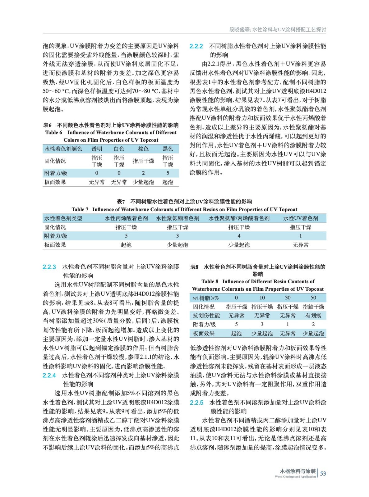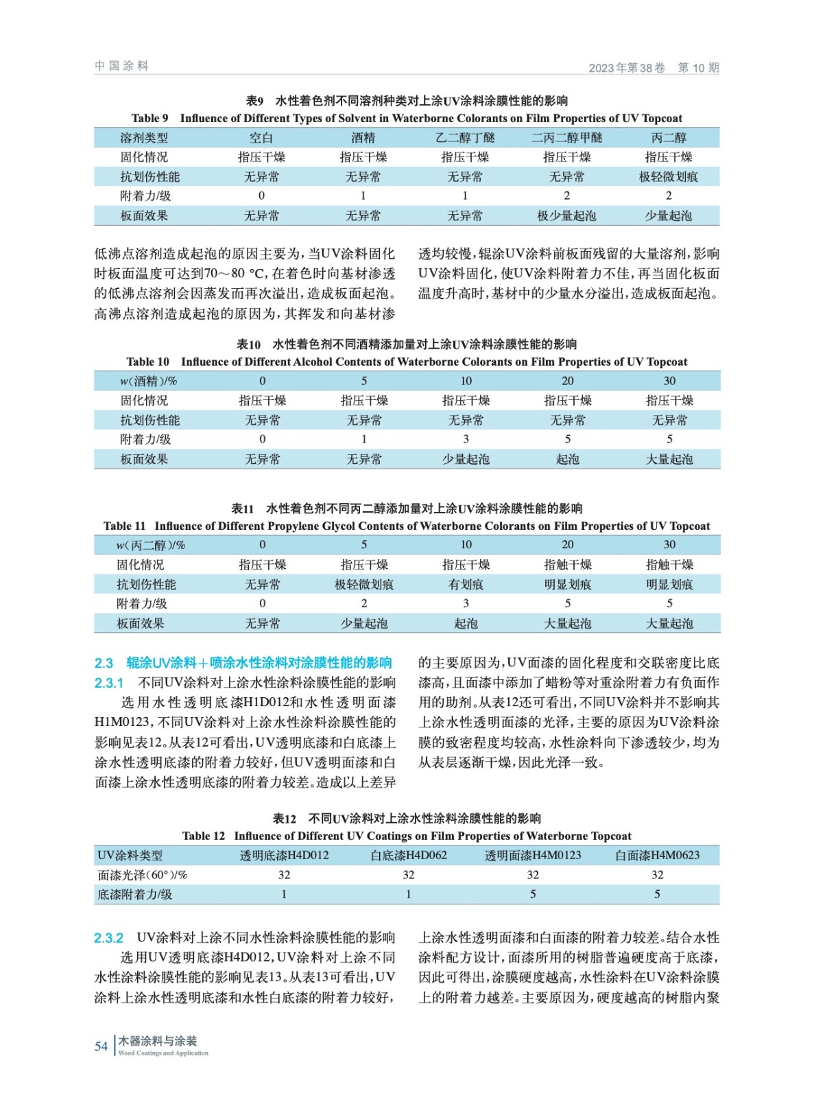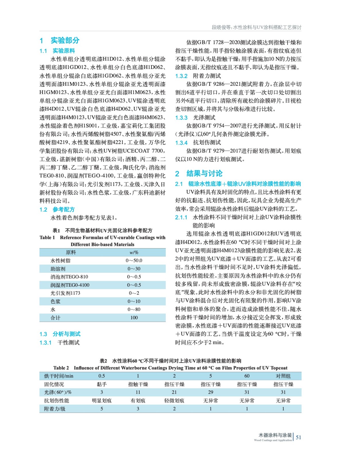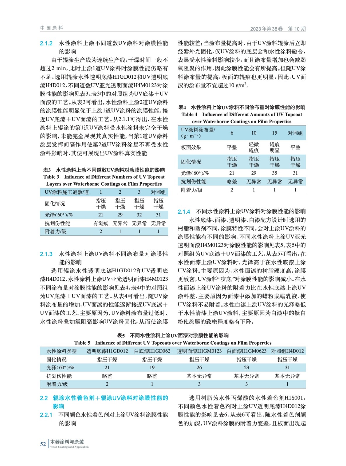 設計了水性底漆+上涂UV涂料、水性涂料著色劑+上涂UV涂料和UV涂料+上涂水性涂料3種涂裝工藝,探明了不同水性涂料、水性涂料中不同成分和不同過程控制參數對涂膜光澤、抗劃傷、起泡情況、附著力等性能的影響規律。