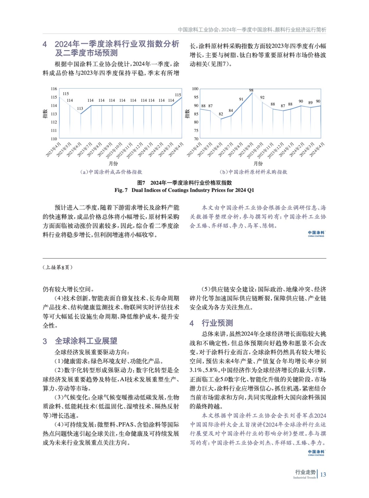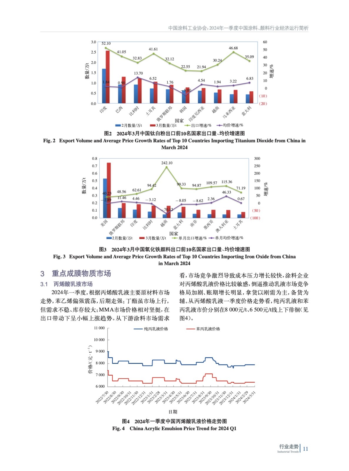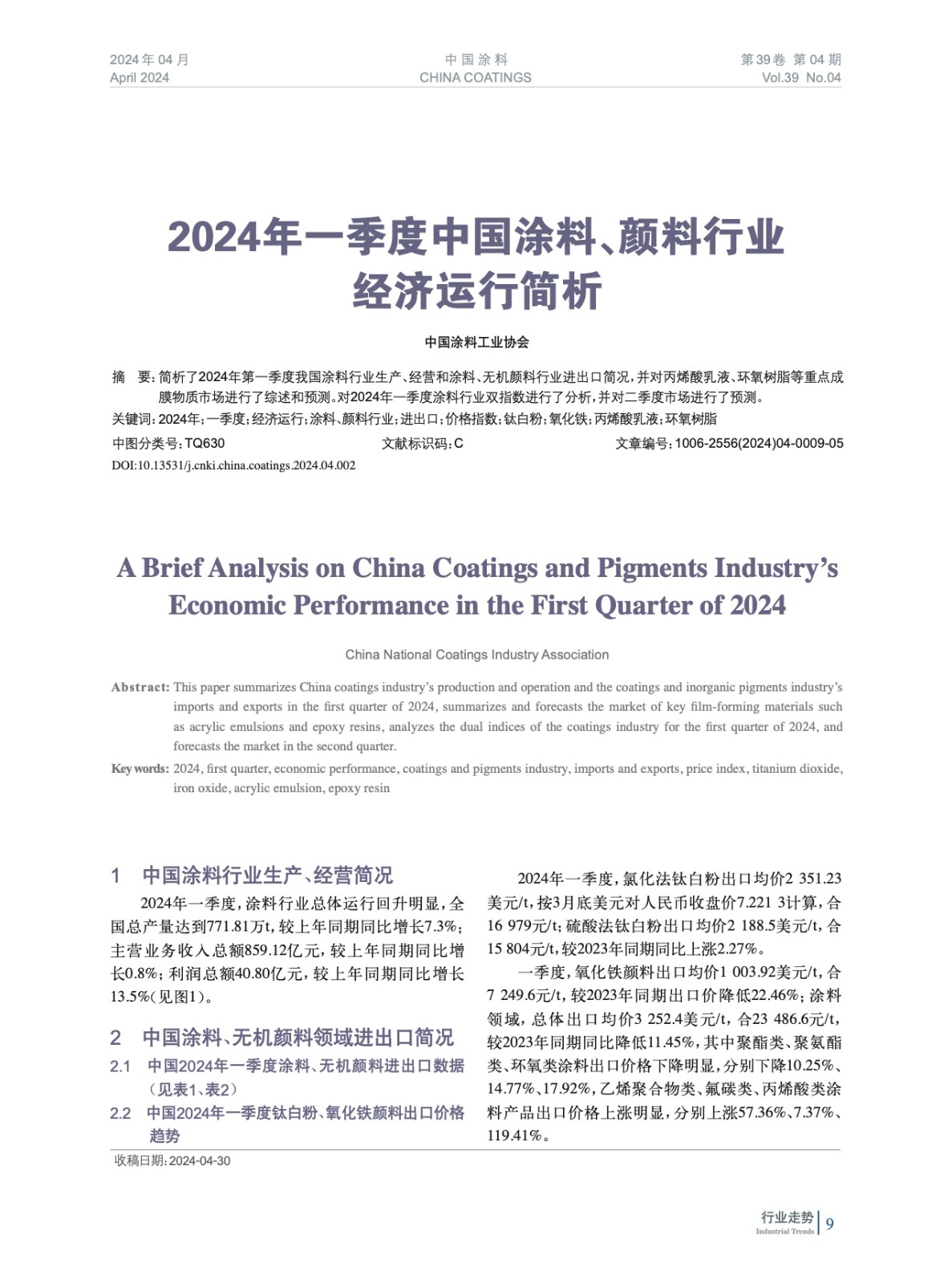 簡析了2024年第一季度我國涂料行業生產、經營和涂料、無機顏料行業進出口簡況,并對丙烯酸乳液、環氧樹脂等重點成膜物質市場進行了綜述和預測。對2024年一季度涂料行業雙指數進行了分析,并對二季度市場進行了預測。
