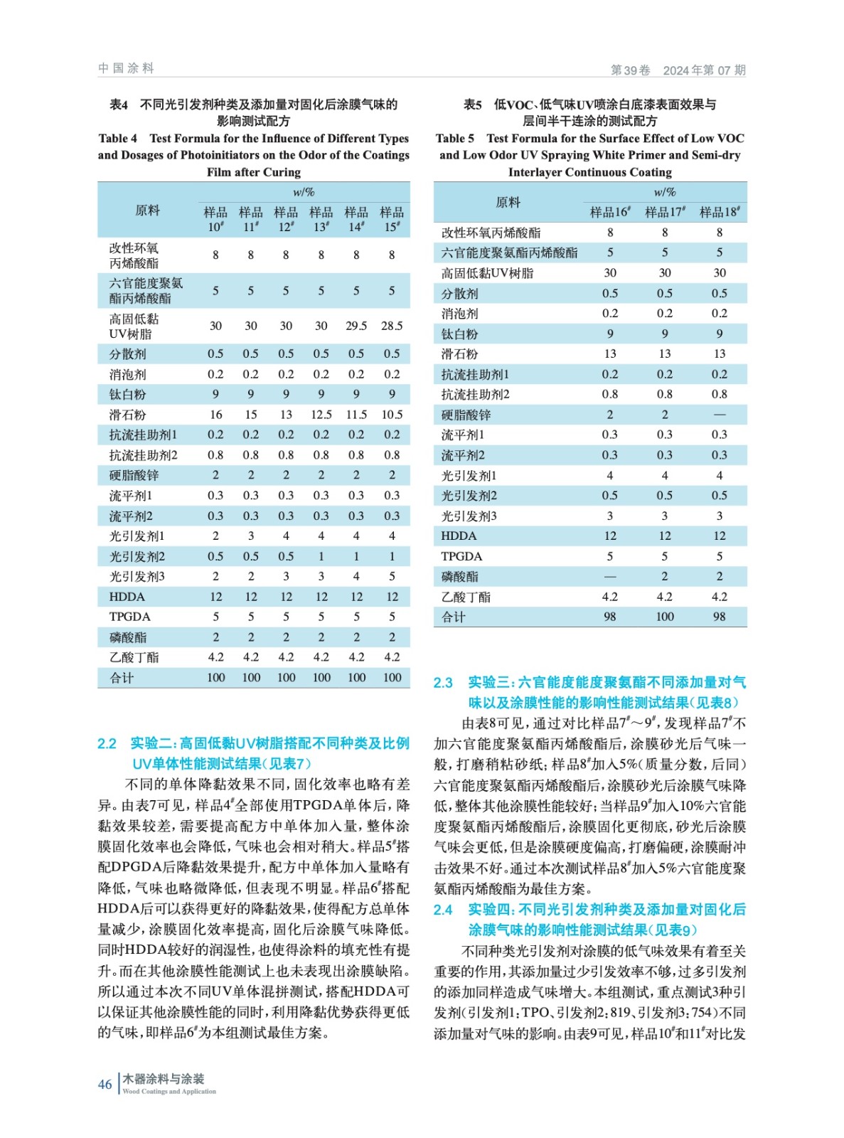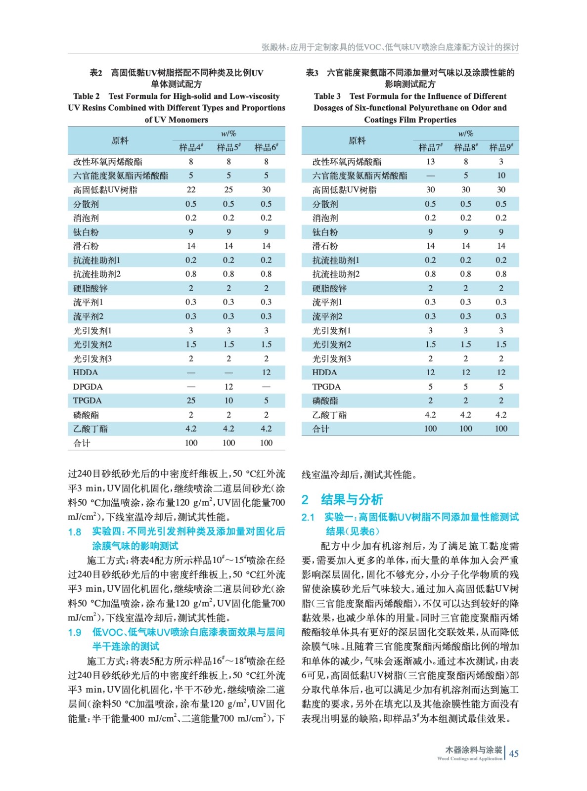 摘要:主要通過使用高固低黏的UV樹脂搭配UV單體減少有機(jī)溶劑添加量,以及添加一定比例的高官能度聚氨酯和深層光引發(fā)劑來實(shí)現(xiàn)深層固化的交聯(lián)密度,通過對(duì)光引發(fā)劑的復(fù)配與不同比例的添加,來進(jìn)一步降低固化后氣味。同時(shí)對(duì)層間連涂測試以及在配方設(shè)計(jì)時(shí)遇到的一些其他需要注意事項(xiàng)做了介紹。