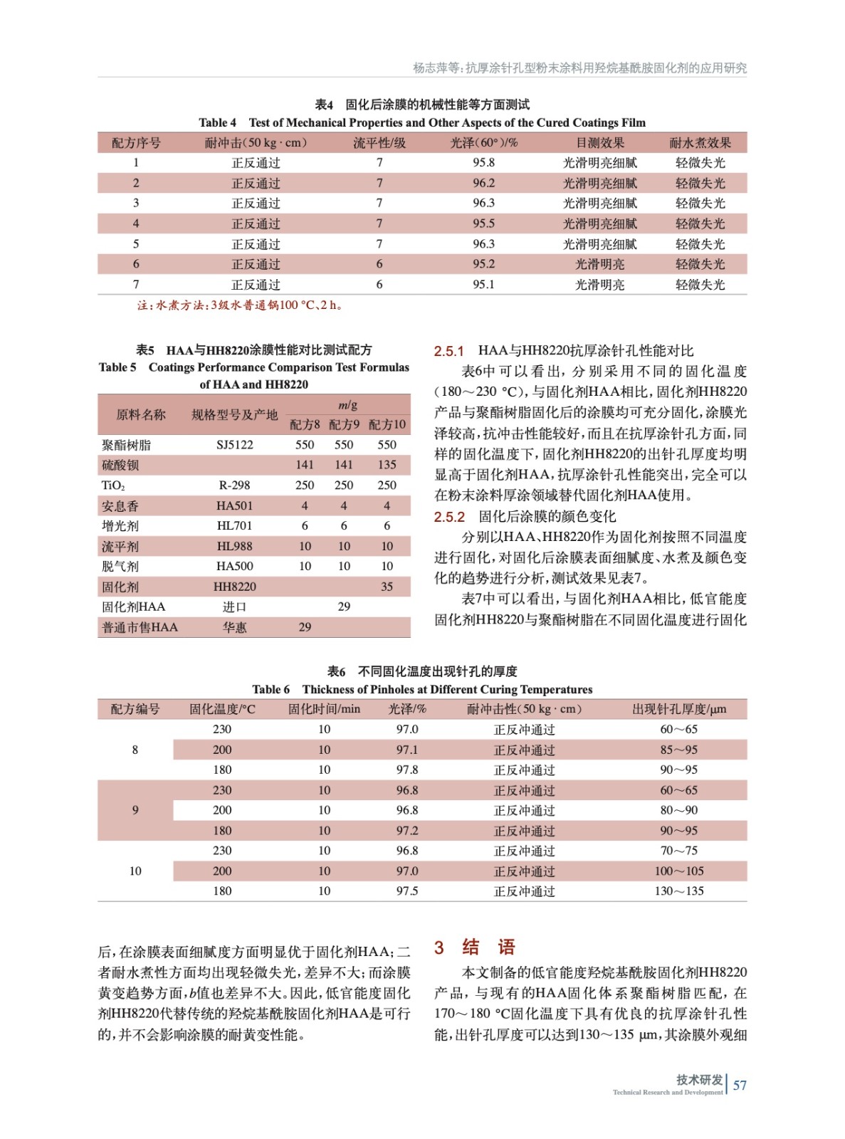 摘要:采用特殊制備的低官能度羥烷基酰胺固化劑,在保證流平性能的前提下,重點研究其在不同固化溫度下的抗厚涂針孔能力,最終結果表明,本羥烷基酰胺固化劑產品具有優良的抗厚涂針孔性能和綜合性能,可以彌補固化劑HAA在厚涂針孔方面的缺陷,可以代替固化劑HAA在粉末涂料厚涂領域中使用。