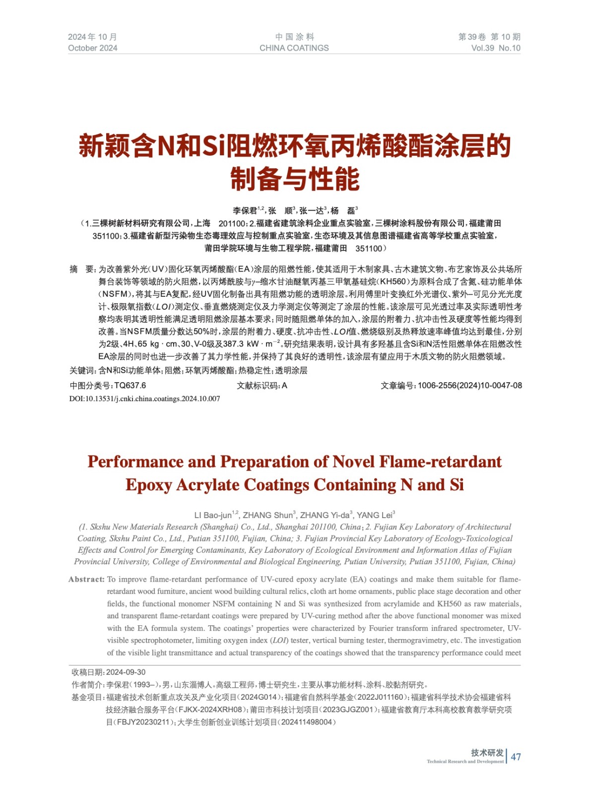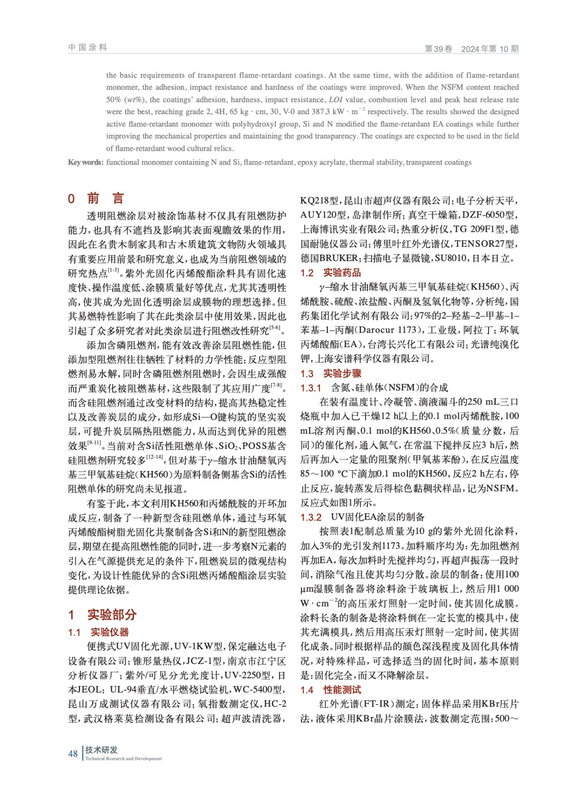 新穎含N和Si阻燃環氧丙烯酸酯涂層的制備與性能