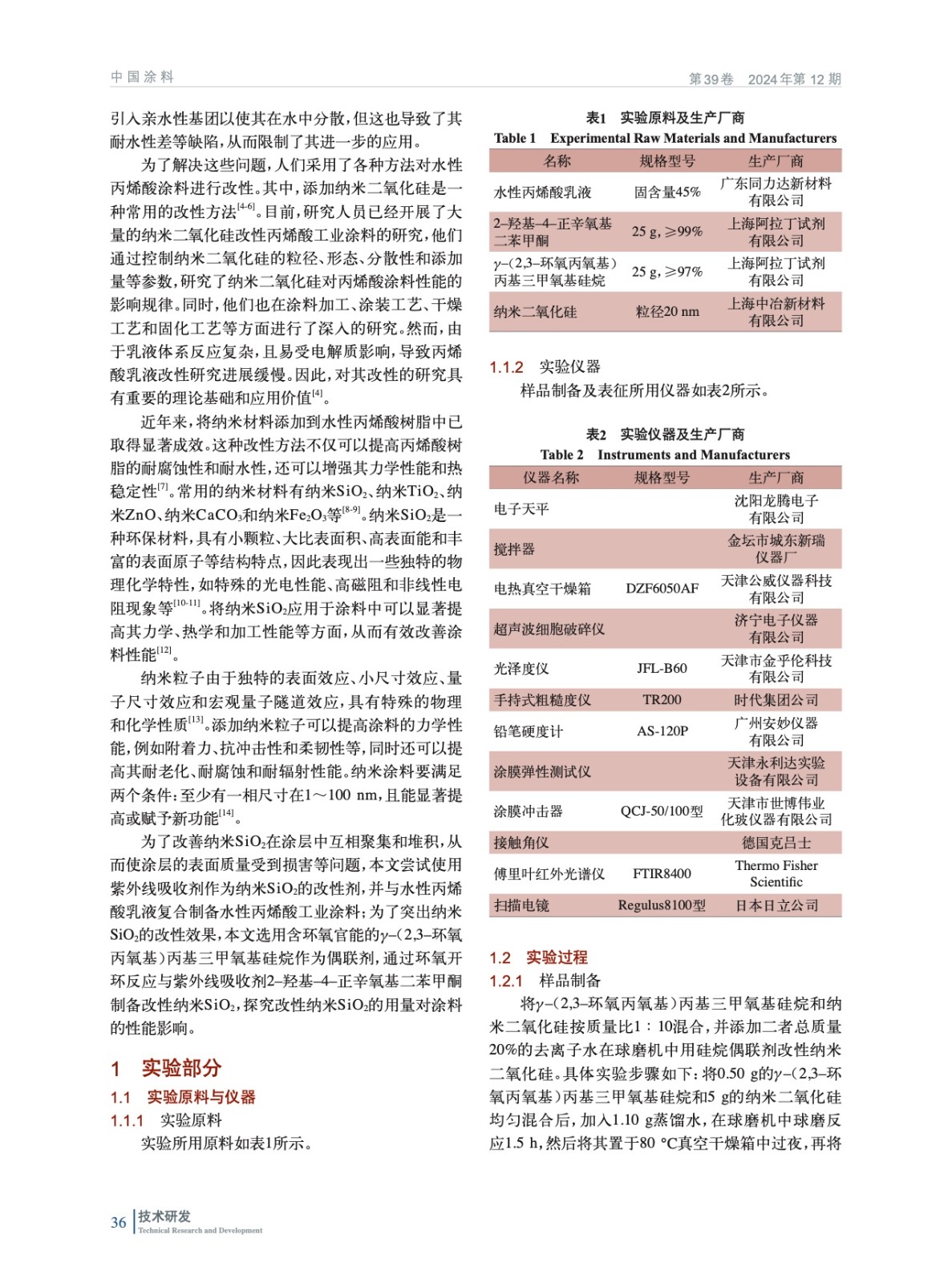 摘要:研究旨在制備負載紫外線的納米二氧化硅(SiO2)改性的水性丙烯酸工業涂料,并研究改性納米SiO2含量對涂料性能的影響。采用了接觸角儀、掃描電鏡、常規物理機械性能等對多種手段對涂膜進行表征。研究結果表明,隨著改性納米SiO2含量的增加,涂層具有較好的常規物理機械性能,并且光澤度有所提高。這表明,改性納米SiO2對涂料的增韌和增強效果顯著,能夠改善涂層的常規物理機械性能和表面性能。然而,當改性納米SiO2含量達到一定值時,增加含量并不能繼續提高涂層的光澤度,甚至會導致涂層表面性能變差。這是因為,改性納米SiO2在涂層中的分散度和填充效果受到含量的影響,達到一定含量后,納米SiO2顆粒之間的互相聚集和堆積現象會加劇,使涂層的表面質量受到損害。