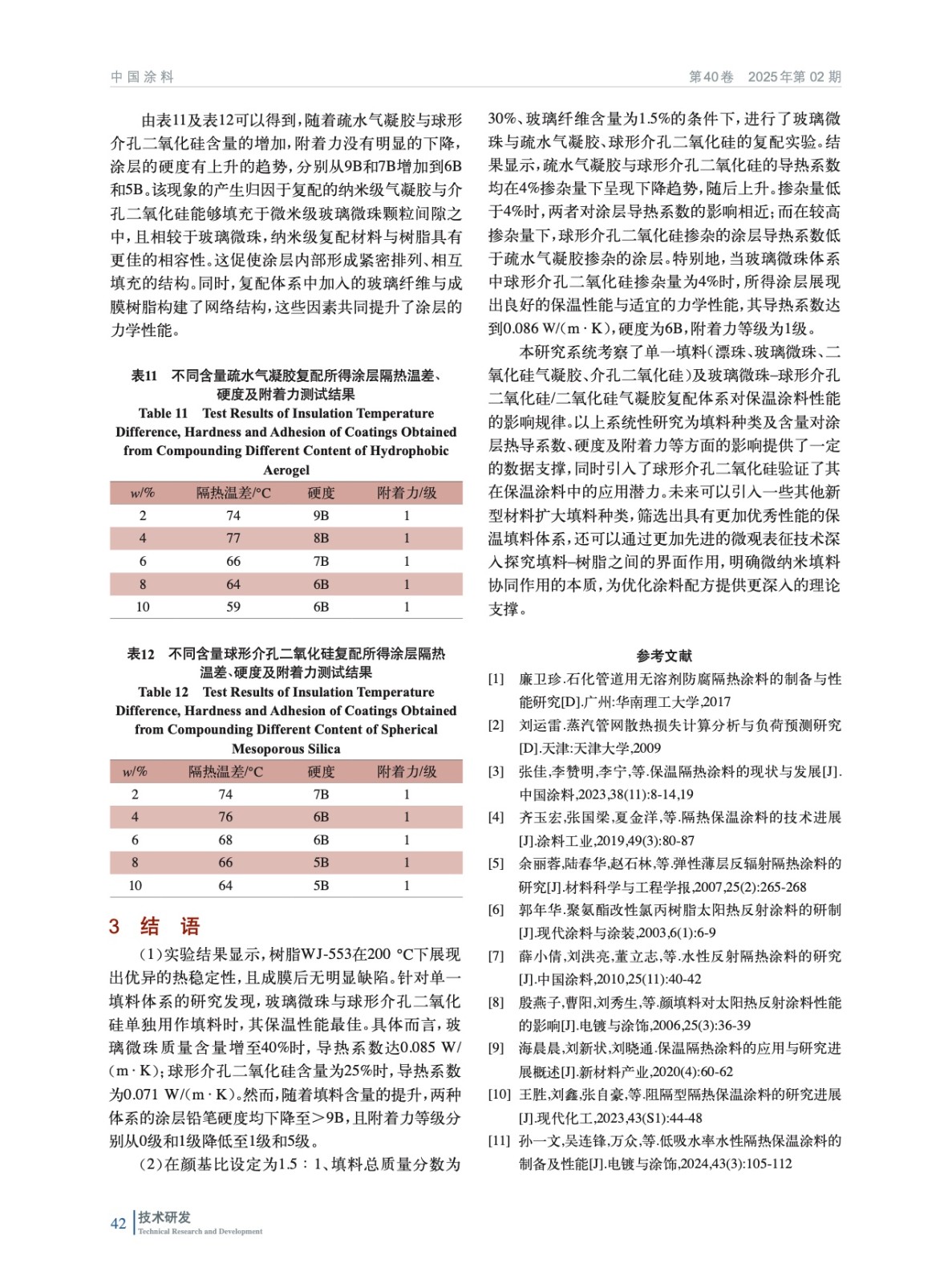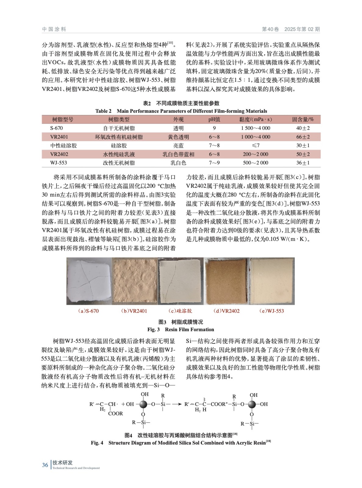 摘要:針對(duì)工業(yè)節(jié)能領(lǐng)域?qū)Ω邷乇夭牧系钠惹行枨螅槍?duì)傳統(tǒng)涂層在200 ℃溫區(qū)存在的厚度過大、施工工藝復(fù)雜及功能單一等問題,系統(tǒng)開展保溫涂層的研發(fā)。選取無機(jī)體系樹脂作為成膜物質(zhì),采用以SiO2為主要成分的漂珠、玻璃微珠、氣凝膠和介孔二氧化硅為填料,通過中空或多孔結(jié)構(gòu)降低熱傳導(dǎo),且適配多種基體的分散性,實(shí)現(xiàn)高效隔熱與工藝兼容性。實(shí)驗(yàn)考察了不同樹脂、填料、顏基比及復(fù)配比例對(duì)保溫涂料隔熱溫差、導(dǎo)熱系數(shù)、硬度和附著力的影響。結(jié)果發(fā)現(xiàn),以無機(jī)體系樹脂WJ-553為成膜樹脂,顏基比1.5∶1,中空玻璃微珠與球形介孔二氧化硅填料總質(zhì)量分?jǐn)?shù)為30%,球形介孔二氧化硅摻雜量為4%時(shí),保溫涂料導(dǎo)熱系數(shù)可達(dá)0.086 W/(m·K),硬度6B,附著力等級(jí)為1級(jí),耐溫性能突破200 ℃閾值。該研究成果為開發(fā)兼具高效隔熱、機(jī)械可靠及施工便利的新型工業(yè)保溫涂層提供了理論依據(jù)和技術(shù)方案,在高溫管道、工業(yè)窯爐等節(jié)能領(lǐng)域展現(xiàn)出重要應(yīng)用價(jià)值。