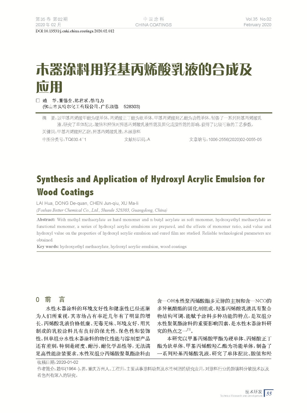 木器涂料用羥基丙烯酸乳液的合成及應用