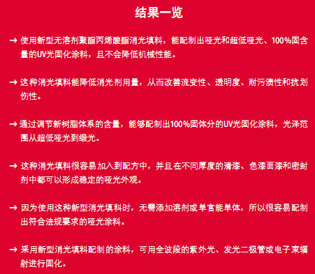 采用這種新型消光填料,就能夠配制出固體份100%的輻射固化涂料(超低光澤至低光澤),同時保留其主要性能,如耐污漬性和透明度。