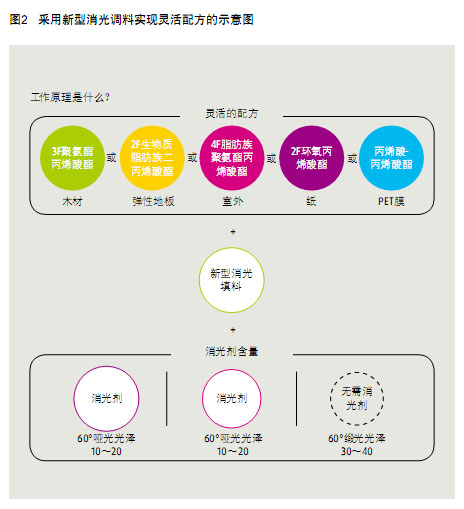 為滿足涂料配方設計者更靈活,更自由地設計配方,最大限度降低庫存和運輸成本,設計了一種新型消光填料,可以作為摻混料廣泛用于多種涂料體系(見圖 2):在紫外線的全波段范圍內或在發光二極管和電子束輻射下固化的涂料及傳統 UV。