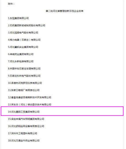 近日,由河北省工業(yè)和信息化廳組織開展的省管理創(chuàng)新示范企業(yè)創(chuàng)建活動(dòng)經(jīng)專家評審并公示,包括河北晨陽工貿(mào)集團(tuán)有限公司在內(nèi)的18家企業(yè)被認(rèn)定為第二批“河北省管理創(chuàng)新示范企業(yè)”。