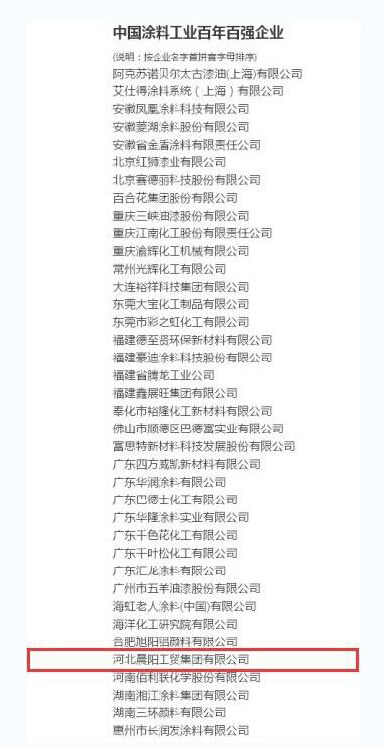 10月10日,由中國(guó)涂料工業(yè)協(xié)會(huì)主辦的中國(guó)涂料工業(yè)百年百?gòu)?qiáng)評(píng)選活動(dòng)結(jié)果公布,晨陽(yáng)水漆當(dāng)選“中國(guó)涂料工業(yè)百年百?gòu)?qiáng)企業(yè)”榮譽(yù)稱號(hào)。