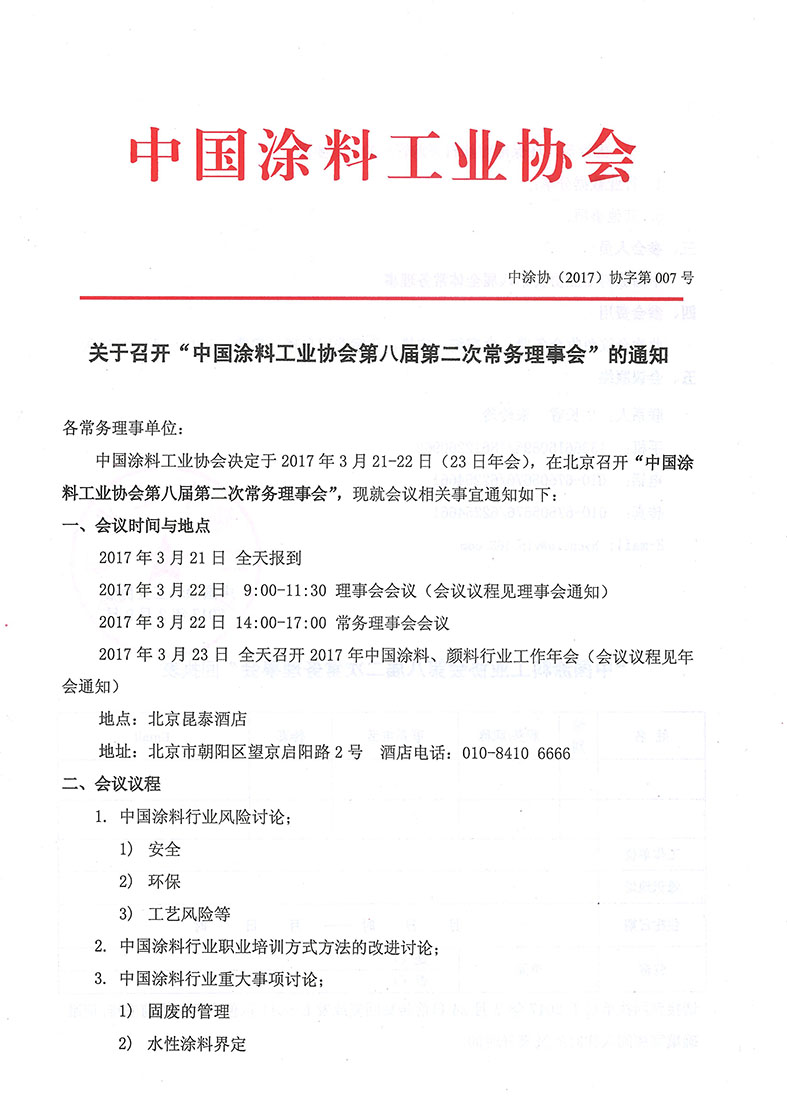 中國涂料工業協會決定于2017年3月21-22日(23日年會),在北京召開“中國涂料工業協會第八屆第二次常務理事會”,現就會議相關事宜通知如下:
