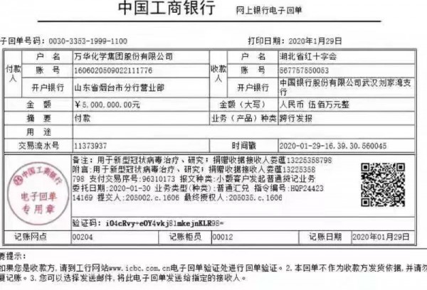 1)向湖北紅十字會捐款現(xiàn)金500萬元人民幣,用于新型冠狀病毒治療研究,醫(yī)療、防護設(shè)施購置,保障醫(yī)護人員安全和病人救治。