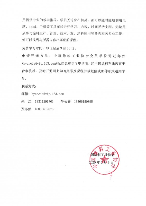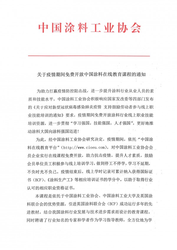 關于疫情期間免費開放中國涂料在線教育課程的通知