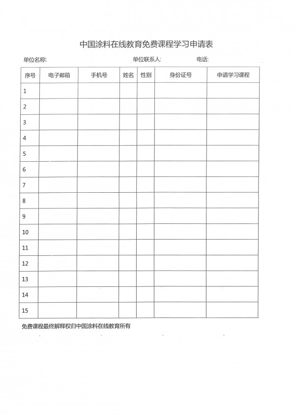 中國涂料在線教育免費課程學習申請表