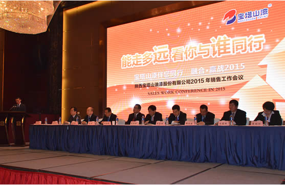 會(huì)議首先由寶塔山漆總經(jīng)理助理李斌代表公司向大會(huì)做主題為“能走多遠(yuǎn) 看你與誰(shuí)同行”的寶塔山漆2014年工作報(bào)告及2015年工作規(guī)劃。報(bào)告中指出寶塔山漆在2014年通過(guò)不斷內(nèi)部自我調(diào)整和外部專業(yè)指導(dǎo),努力適應(yīng)新常態(tài),在新常態(tài)中探尋適合企業(yè)發(fā)展的路徑,并通過(guò)業(yè)績(jī)、品牌、開發(fā)、結(jié)構(gòu)、服務(wù)、研發(fā)、建設(shè)7個(gè)關(guān)鍵詞梳理了寶塔山漆2014年全年的工作思路。2014年寶塔山公司共完成涂料產(chǎn)品銷售4萬(wàn)余噸,比上年同期增長(zhǎng)1千噸,實(shí)現(xiàn)銷售額4.22億元,上交稅金3 000余萬(wàn)元。寶塔山漆加強(qiáng)推進(jìn)品牌建設(shè)力度,促進(jìn)企業(yè)不斷發(fā)展壯大,2014年被陜西省工業(yè)和信息化廳認(rèn)定為“工業(yè)品牌培育示范企業(yè)”,并大力開發(fā)利用微博、微信、電子商務(wù)平臺(tái)等新的品牌宣傳渠道,有力地提升了寶塔山漆在終端消費(fèi)市場(chǎng)的知名度。此外,2014年寶塔山漆在工程工業(yè)客戶的開發(fā)方面卓有成效,拓展了車輛改裝、鋼結(jié)構(gòu)、重型機(jī)械制造、建筑內(nèi)外墻等終端領(lǐng)域,并對(duì)經(jīng)銷商、代理商和加盟商進(jìn)行了深掘挖潛,得到了市場(chǎng)的廣泛認(rèn)可。公司市場(chǎng)結(jié)構(gòu)調(diào)整和產(chǎn)品結(jié)構(gòu)調(diào)整順應(yīng)了國(guó)家經(jīng)濟(jì)結(jié)構(gòu)調(diào)整的步伐,各大品類均有了不同程度的增長(zhǎng),尤其在水性涂料方面實(shí)現(xiàn)了跨越式增長(zhǎng),與上年同比增長(zhǎng)30%,真石漆、多彩漆、刮砂漆等方面也均有突破。2014年初根據(jù)公司產(chǎn)品戰(zhàn)略規(guī)劃,投資200萬(wàn)元建設(shè)了西北地區(qū)最大的藝術(shù)涂料生產(chǎn)線,以滿足市場(chǎng)需求。