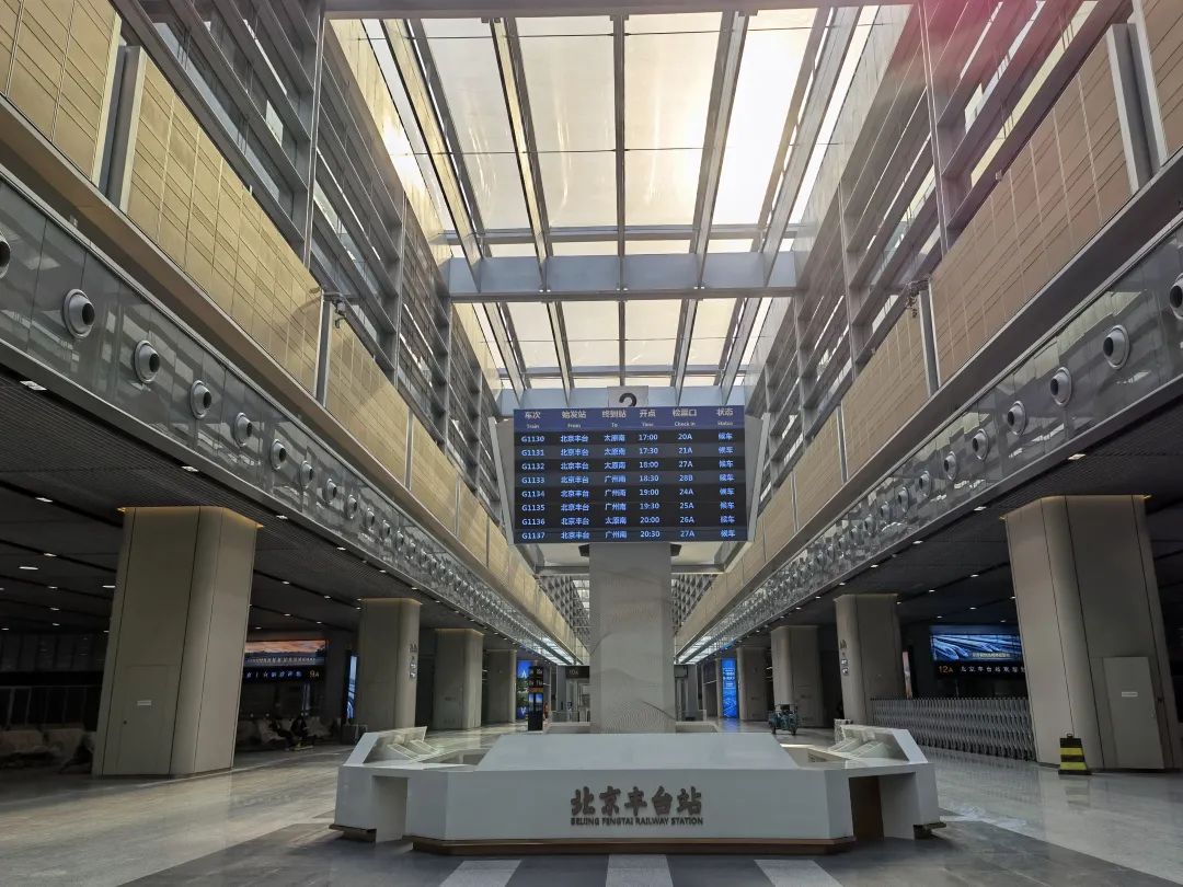 在北京西三環與西四環之間,一座新地標拔地而起。從空中俯瞰,豐臺站呈獨特的“中”字造型。地上四層、地下一層,擁有17臺32線,最高聚集人數1.4萬人,光站房建筑面積就有40萬平方米,相當于兩個半故宮建筑規模。