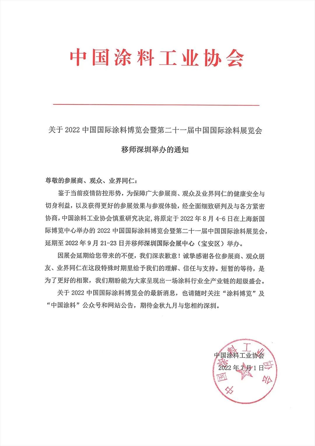 7月1日,中國涂料工業(yè)協(xié)會(huì)正式官宣,將原定于2022年8月4-6日在上海新國際博覽中心舉辦的2022中國國際涂料博覽會(huì)暨第二十一屆中國國際涂料展覽會(huì),移師深圳國際會(huì)展中心(寶安區(qū))舉辦。
