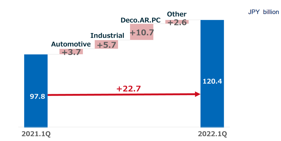 關(guān)西涂料各品類,在第一季度均進(jìn)行了提價,尤其是汽車涂料和工業(yè)涂料也進(jìn)行了提價動作。從環(huán)比上漲看,汽車涂料涂料收入增加37億日元,工業(yè)涂料增加57億日元,裝飾涂料增加107億日元。