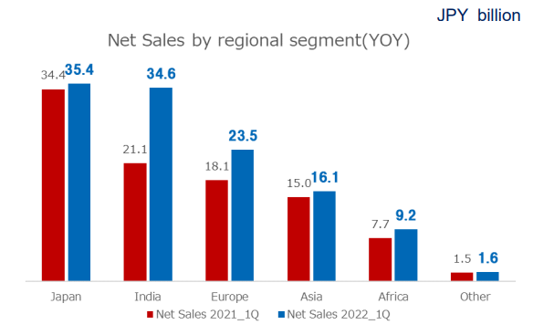 涂料產(chǎn)品類別銷售收入增長情況從銷售區(qū)域來看,關(guān)西涂料各地區(qū)的銷售額普遍增長,尤其是印度地區(qū)的爆發(fā)性增長,極大地支撐了關(guān)西涂料的整體銷售業(yè)績。日本銷售額增長10億日元,印度增長135億日元,歐洲增長11億日元,亞洲和非洲增長11億和16億日元。