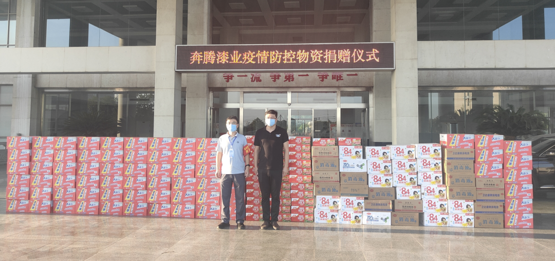 9月6日,奔騰漆業先后向鳧山街道辦事處、太平鎮政府捐贈防疫物資,包括方便面140箱,火腿腸70箱,醫用84消毒液40箱,醫用75%酒精40箱,總價值約五萬元。讓愛和擔當在抗疫一線傳遞,與疫情防控人員齊心協力,共筑防疫“同心圓”。