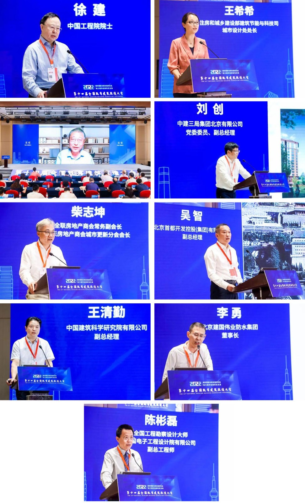 大會特邀嘉賓中國工程院院士徐建,住房和城鄉建設部建筑節能與科技司城市設計處處長王希希,中國工程院院士江億,中建三局集團北京有限公司黨委委員、副總經理劉創,全聯房地產商會常務副會長、全聯房地產商會城市更新分會會長柴志坤,北京首都開發控股(集團)有限公司副總經理吳智,中國建筑科學研究院有限公司副總經理王清勤,北京建國偉業防水集團董事長李勇,全國工程勘察設計大師、中國電子工程設計院有限公司副總工程師陳彬磊分別做主題演講。此外,劉創、吳智、李勇從不同維度就城市更新路徑、實施模式、創新解決方案等進行了報告,并分享了相關工程案例。