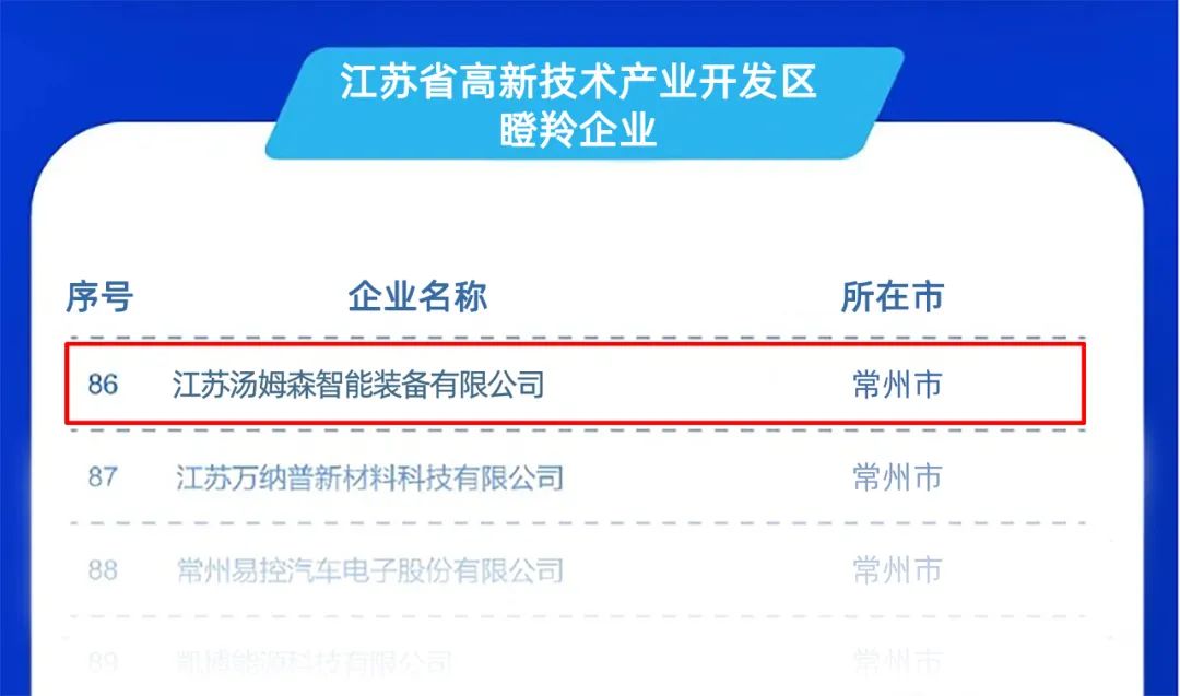 江蘇省高新技術產業開發區瞪羚企業:江蘇湯姆森智能裝備有限公司