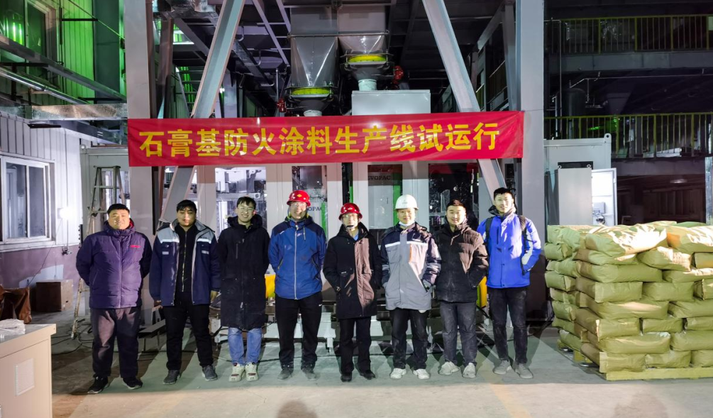 小年逢喜!2023年1月14日18時00分,隨著操作人員按下啟動按鈕,新石膏基防火涂料生產線成功出料,順利進入試生產階段。經測試,所產成品各項性能指標均符合相關標準,標志著新石膏基防火涂料生產線建設項目取得了階段性勝利。