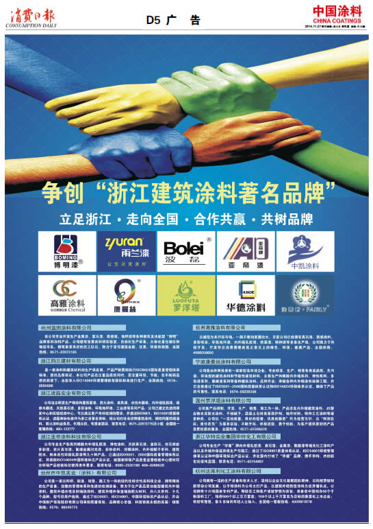 《中國涂料報》(電子版)的一切內容(包括但不限于文字、圖片、PDF、圖表、標志、標識、商標、版面設計、專欄目錄與名稱、內容分類標準以及為讀者提供的任何信息)僅供中國涂料信息網讀者閱讀、學習研究使用,未經中國涂料雜志社有限公司及/或相關權利人書面授權,任何單位及個人不得將《中國涂料報》(電子版)所登載、發布的內容用于商業性目的,包括但不限于轉載、復制、發行、制作光盤、數據庫、觸摸展示等行為方式,或將之在非本站所屬的服務器上作鏡像。否則,中國涂料雜志社有限公司將采取包括但不限于網上公示、向有關部門舉報、訴訟等一切合法手段,追究侵權者的法律責任。